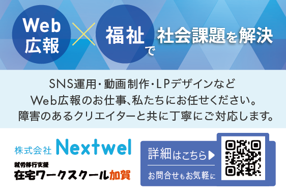 このように、在宅ワークスクール加賀ではwebデザインや動画など興味のある分野を学んでいただいています。今後も、利用者さんがご自身の興味を活かしながら就労に向かえるようお手伝いができたらと思っております。次はどんな作品が利用者さんから生み出されるのか、スタッフ一同楽しみに見守っていきたいです。
